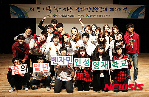 【서울=뉴시스】임태훈 기자 = 6일 서울 강남구 청담동 일지아트홀에서 열린 ‘2015 벤자민인성영재페스티벌’에서 벤자민학교 강남학습관 학생들이 기념사진을 촬영하고 있다. 2015.11.06.(사진=벤자민인성영재학교 제공)
