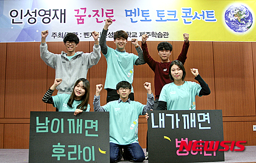 서울=뉴시스】최진석 기자 = 10일 제주 상공회의소에서 열린 '꿈·진로 멘토 토크 콘서트'에서 벤자민인성영재학교 제주학습관 학생들이 인성 메시지 퍼포먼스를 하고 있다. 2015.11.11. (사진=벤자민인성영재학교 제공)