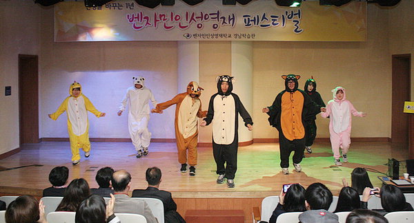 29일 경남 창원시 우리누리청소년문화센터에서 열린 '2015 벤자민인성영재페스티벌'에 참가한 학생들이 동물 복장으로 춤을 추고 있다. 이날 행사는 대안교육기관인 벤자민인성영재학교 경남학습관이 마련했다. 벤자민인성영재학교 제공