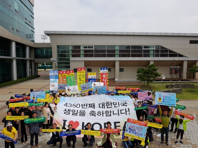 개천절인 3일 청주시교육지원청 대회의실에서 (사)국학원이 주최하고 (사)충북국학원이 주관한 '개천문화 페스티벌'이 열린 가운데 참가자들이 '홍익인간' 이념을 되새기는 퍼포먼스'를 하고 있다. 사진제공=충북국학원